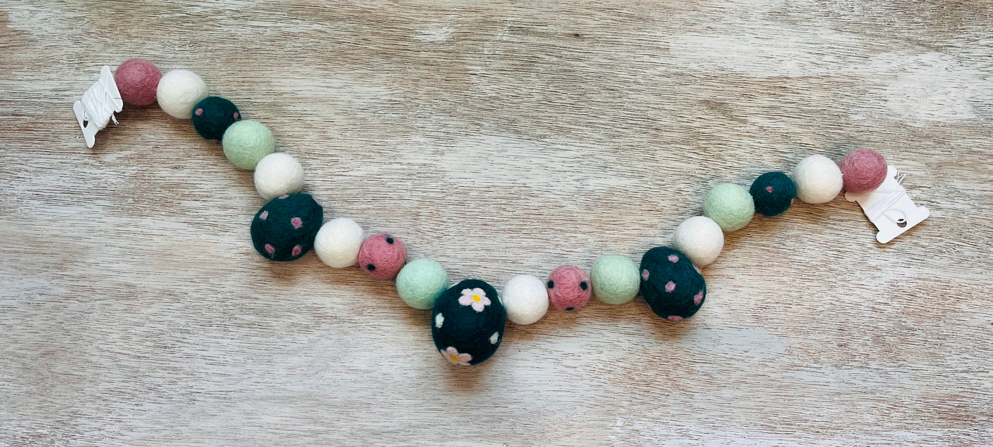 Flower felted and polka dot eggs paired with poms