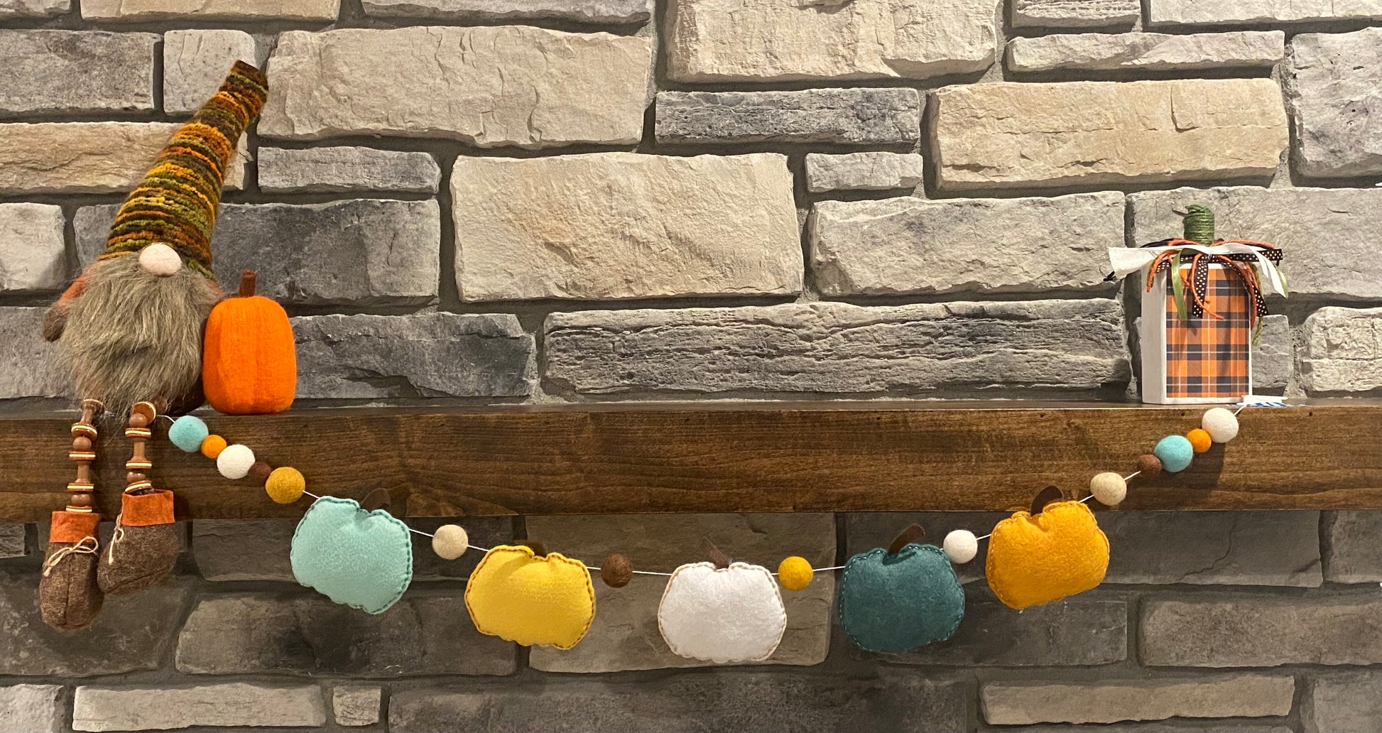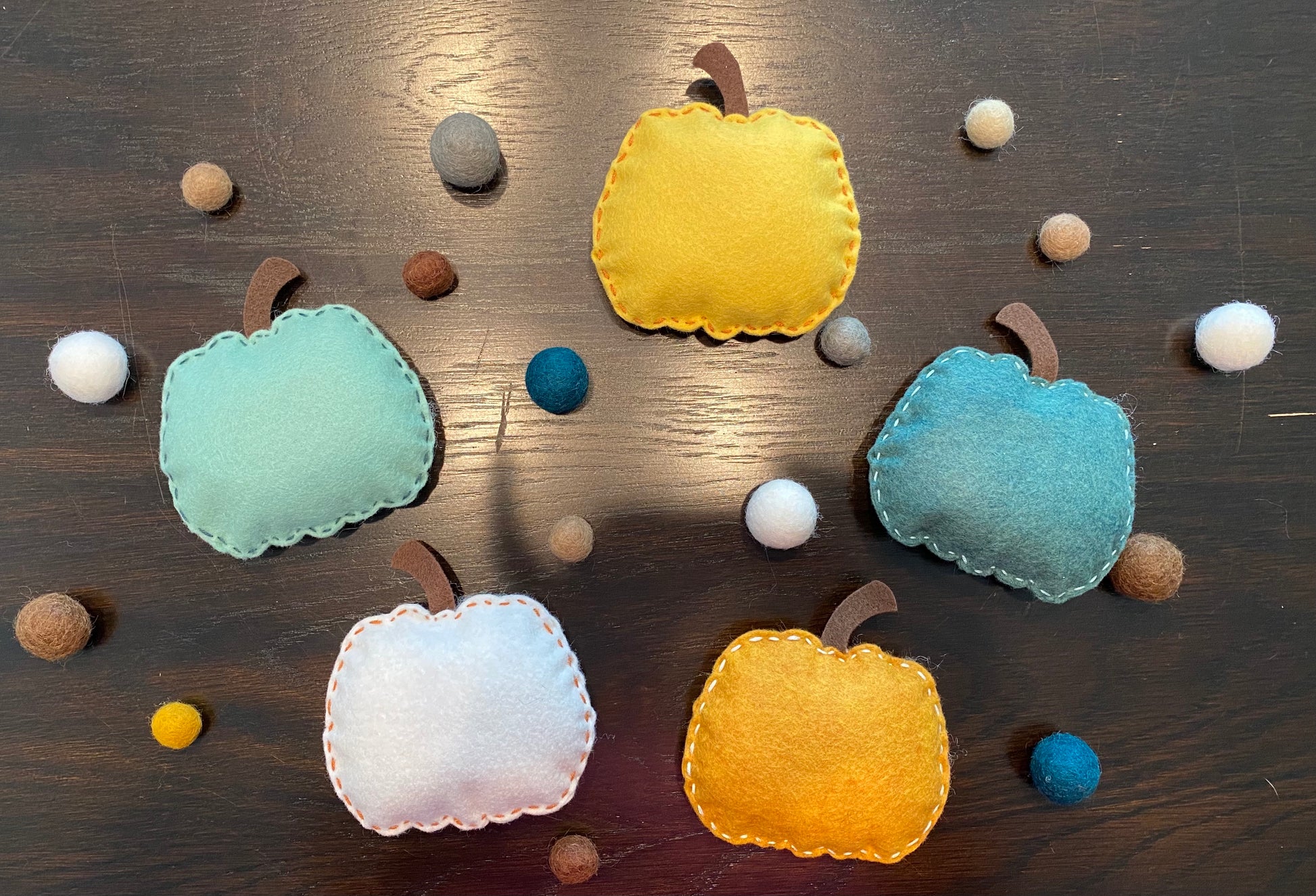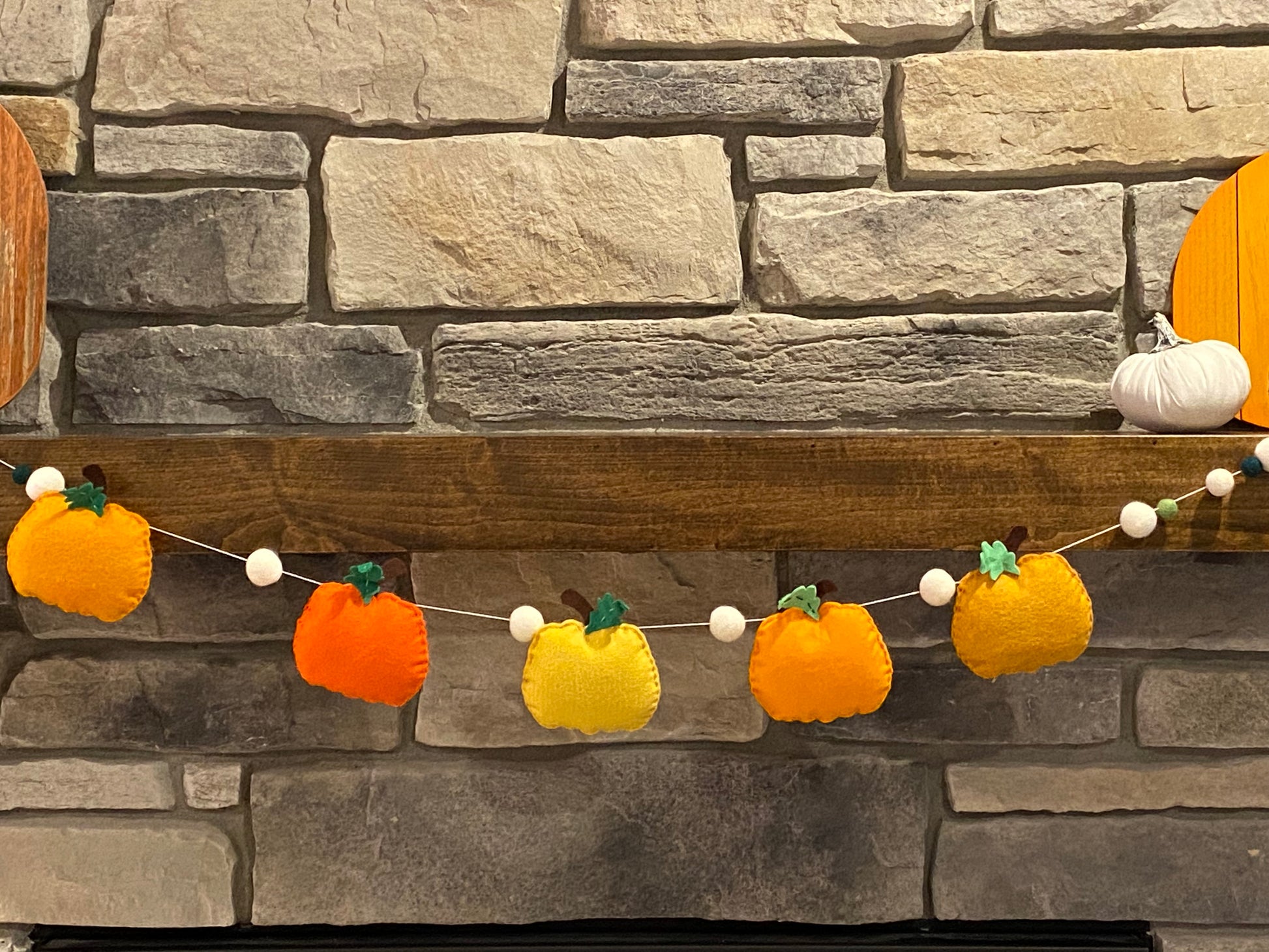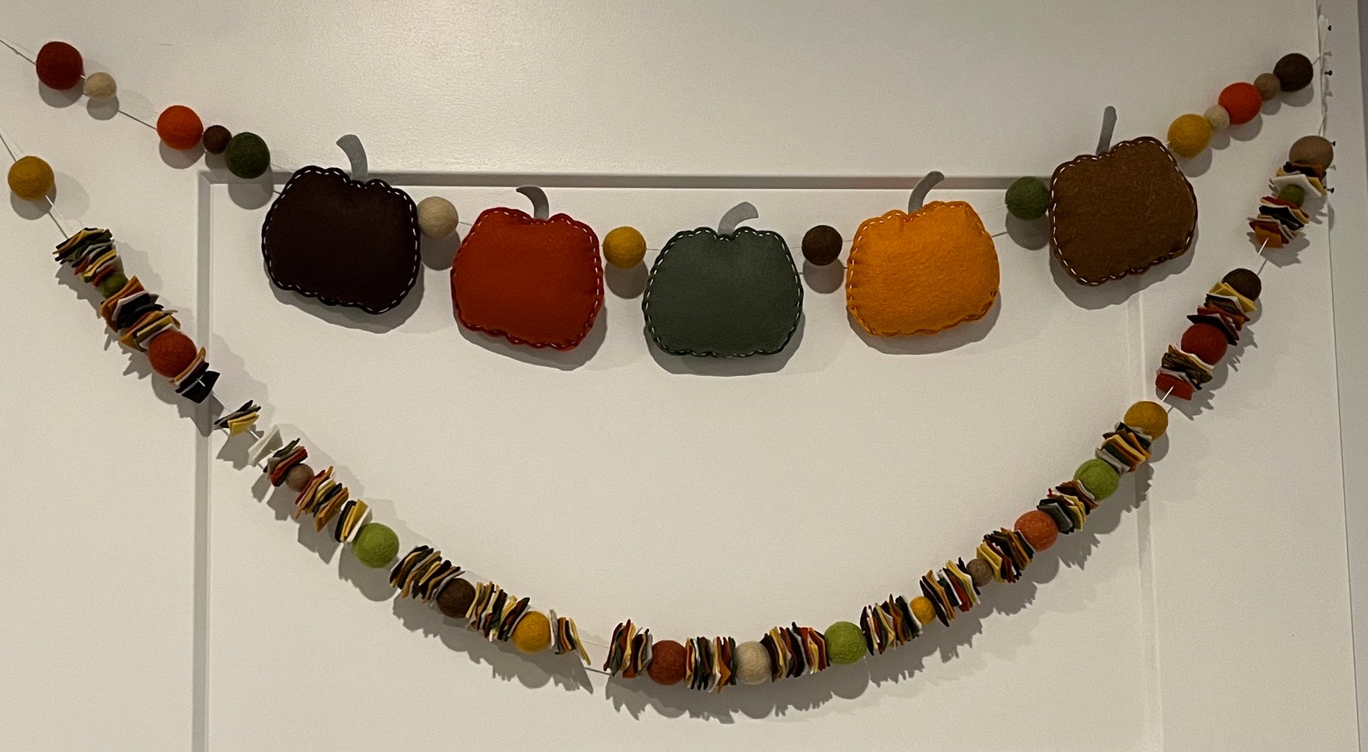 5 colors of hand sewn Felt pumpkins. Stung on 10ft of string.